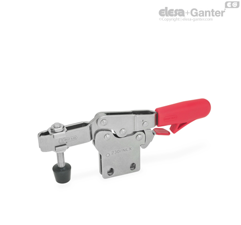 Toggle clamps in the U-bar version with two flanged washers (type NL) can accommodate an application specific clamping screw. A clamping screw with neoprene rubber tip is also included for type NLC.