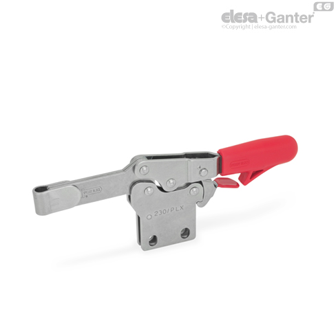 Toggle clamps in the type PL version can either be utilized by welding the clasp which can then accommodate an application specific hold-down fastener component, or by utilizing the bar in conjunction with the GN 809 holders for clamping screws to hold the work piece in place.