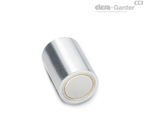 Retaining magnets GN 52.2 are combined with a steel housing and insulation of brass/aluminum or plastic into a system that shields and strengthens the magnet for optimal transmission of the magnetic flux onto the magnetic surface.