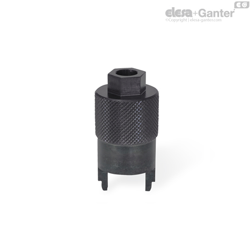 GN 355.1 assembly tools serve to adjust GN 355 levelling elements. They are used in connection with a T-wrench or a hexagonal angle socket spanner. To ease levelling, the top end of the assembly tool has an external hexagon head which is used for turning the levelling screw with a ring spanner, ideally with a ratchet function.