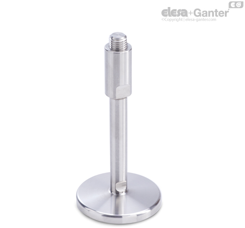 At a spindle thread size M 10 and higher, the static load of the leveling feet GN 21 is limited owing to the permissible contact pressure of the adjustment spindle acting on the base plate (at a spindle strength ≥ 500 N/mm2). The values given in the table (valid for type D0 without rubber pad) assume a clean pressure load perpendicular to the base plate. Bending and buckling stress which often occurs in practice results in a lower load-bearing capacity of the adjustment spindle and may have to be taken into account.