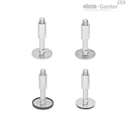 Leveling feet GN 41 are for use in aggressive environments. The range of combinations of base plates and adjustable spindle versions allows these leveling feet to be used in every situation.