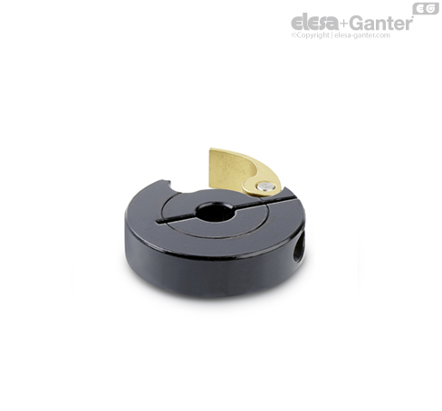 Quick release shaft collars GN 704 are clamped by reducing the slot height using an eccentric lever.