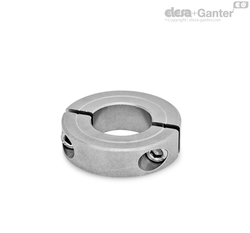 Split shaft collars GN 707.2 correspond in measurement to the semi-split shaft collars GN 706.2. They are used when an axial assembly is not possible. These shaft collars can safely and simply be assembled by reducing the slot height with high clamping force and thus they act, for instance, like an end stop. The surface of the shaft or the axle is not damaged.