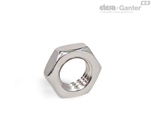 The flat design makes the hex nuts ideal for shorter threads. When mounting indexing plungers, they reduce the adjustment range only slightly, which may be of significance especially when using two lock nuts.
