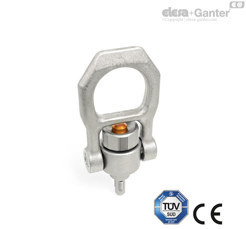 The shackle swivels by 180°, fully rotates around the pin and always aligns itself in the direction of load without causing the pin to turn. This prevents the threaded lifting pin from being screwed out of the thread and the workpiece can be lifted safely. A safety bar protects the button from unintentional operation.