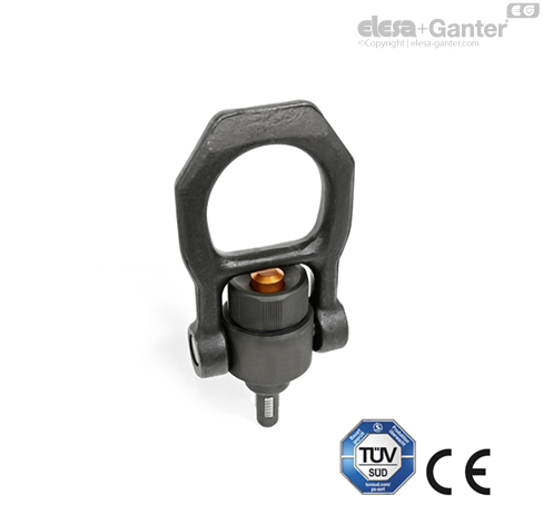 The shackle swivels by 180°, fully rotates around the pin and always aligns itself in the direction of load without causing the pin to turn. This prevents the threaded lifting pin from being screwed out of the thread and the workpiece can be lifted safely. A safety bar protects the button from unintentional operation.