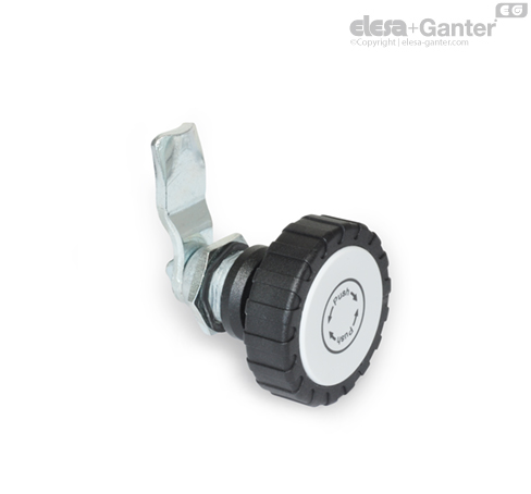 Latches GN 115.9 have a push-to-turn safety function. In the two end positions the spindle is locked in place by the latch. The device can be turned 90° only when the operating element is pressed down, which releases the safety pin from the locked position. This feature protects the latch reliably from moving on its own or as the result of vibrations.
