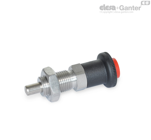 Indexing plungers GN 414 with safety function are used when the inadvertent retraction of the plunger pin is to be prevented. The protruding plunger is first locked and may be unlocked for pulling only by exerting axial pressure on the red safety push-button