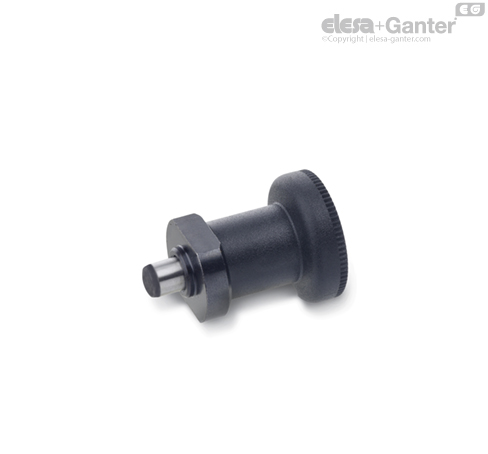 Indexing plungers GN 607.5 with rest position are used in cases where the indexing pin is temporarily not allowed to protrude. After pulling out, the knob is turned by 90°.
