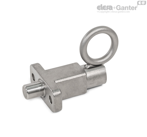 With indexing plungers GN 722.5, the plunger pin is actuated via the pull ring / latch. This is done either manually, with a cable or by means of an extended pull rod with hook. The ST version is designed for applications in steel construction, whereas the stainless steel version A4 is suitable for use in particularly aggressive environments.