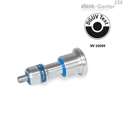 Identification VH: Knob an pin side Hygienic Design (full hygiene): Indexing plungers GN 8170 are certified according to DGUV Test guidelines, and with their additional sealing nuts, they meet hygiene requirements on the knob and pin sides (full hygiene). Wipers between knob and guide and between guide and pin as well as sealing rings on the guide and sealing nut keep the locking mechanism leak-tight. At the same time, the high surface quality and dead-space-free mounting prevent dirt from adhering and facilitate cleaning.