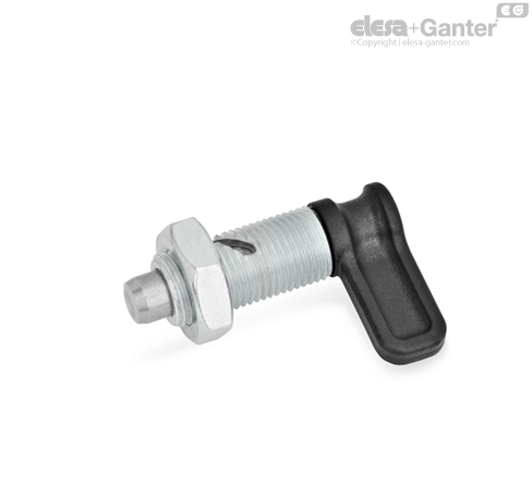 Cam action indexing plungers GN 712 are used in such applications where the plunger pin must not protrude continually. When turning the cam by 90° resp.120° degrees in anti-clockwise direction, the plunger pin is moved through a curved opening in the body. After that, the plunger pin is retracted.