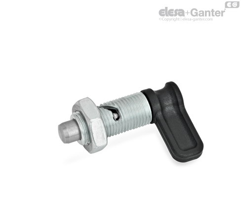 Cam action indexing plungers GN 712 are used in such applications where the plunger pin must not protrude continually. When turning the cam by 90° resp.120° degrees in anti-clockwise direction, the plunger pin is moved through a curved opening in the body. After that, the plunger pin is retracted.