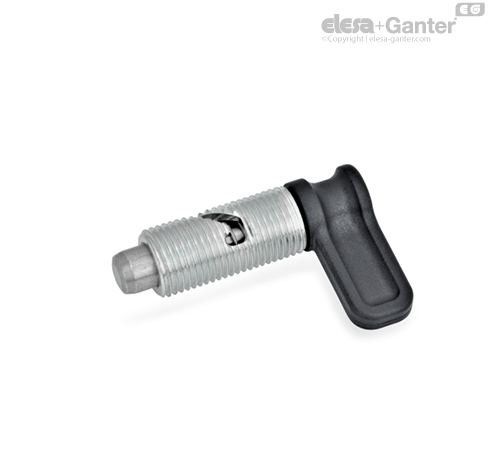 Cam action indexing plungers GN 712 are used in such applications where the plunger pin must not protrude continually. When turning the cam by 90° resp.120° degrees in anti-clockwise direction, the plunger pin is moved through a curved opening in the body. After that, the plunger pin is retracted.