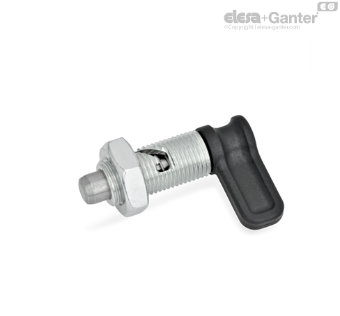 Cam action indexing plungers GN 712 are used in such applications where the plunger pin must not protrude continually. When turning the cam by 90° resp.120° degrees in anti-clockwise direction, the plunger pin is moved through a curved opening in the body. After that, the plunger pin is retracted.