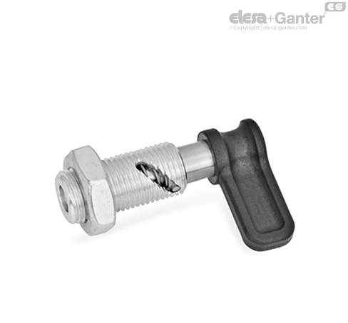 Cam action indexing plungers GN 712.1 are used in such applications where the plunger pin has to protrude only occasionally. When turning the cam by 90° resp.120° degrees in anti-clockwise direction, the plunger pin is moved through a curved opening in the body. After that, the plunger pin is protruded.