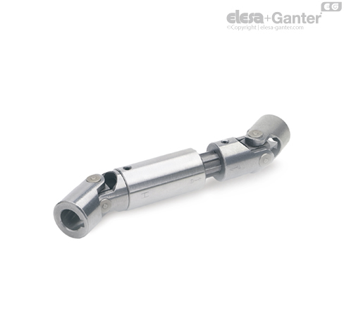 Universal joint shafts with needle bearing GN 808.3 not only join the offset between two shafts, but also enable the alignment of lengths, which depending on the overall length l1 enables the corresponding extraction length l2. The power transmission is achive-bed by two universal joints DIN 808 (type EW) a splined shaft and a sliding sleeve. It is important to check the accuracy when connecting the splined shaft to the sliding sleeve. The markings -> <- have to be opposite to each other. Any kind of misconnection leads to an inhomogeneous output and to a quick abrasion.