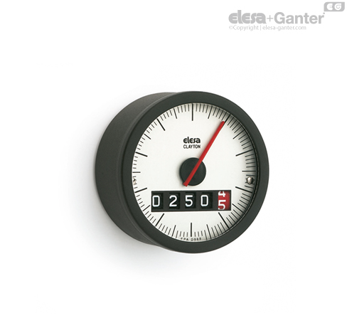 Five-digits roller counter and one red pointer which turns on the graduated dial. The digit of the red roll shows the decimal values, while the pointer shows the hundredth.