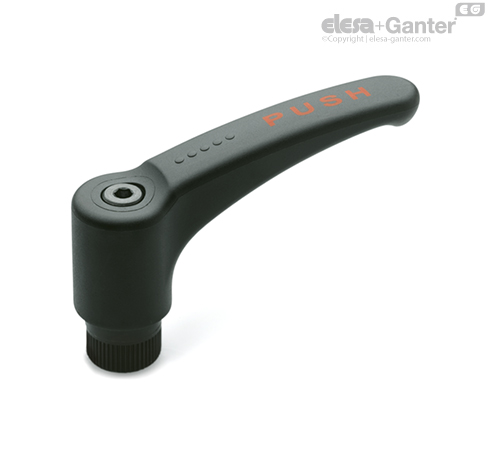 Glass-fibre reinforced polyamide based (PA) technopolymer, grey-black colour, matte finish. Red writing with "PUSH" tampoprinted on the lever body (avoid contact with solvents, alcohol or detergents containing alcohol).