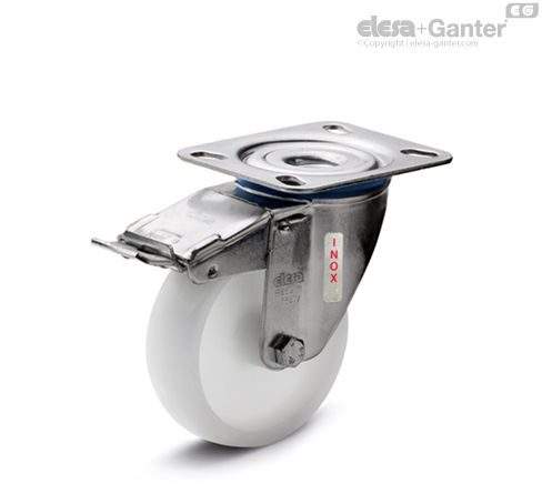 Pocinkana pločevina iz plemenitega jekla. Ohišje je zasnovano za nosilnost do 3000 N. Dvojni kroglični ležaj in neposreden stik med ploščo in obročem krogličnega ležaja z vgrajenim zatičem zagotavlja odlično manevrirnost. Ne zahteva vzdrževanja. Sestavljeno iz (glejte sliko 1):