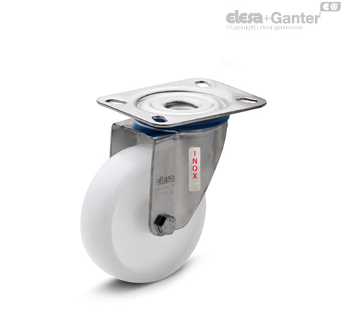 Pocinkana pločevina iz plemenitega jekla. Ohišje je zasnovano za nosilnost do 3000 N. Dvojni kroglični ležaj in neposreden stik med ploščo in obročem krogličnega ležaja z vgrajenim zatičem zagotavlja odlično manevrirnost. Ne zahteva vzdrževanja. Sestavljeno iz (glejte sliko 1):