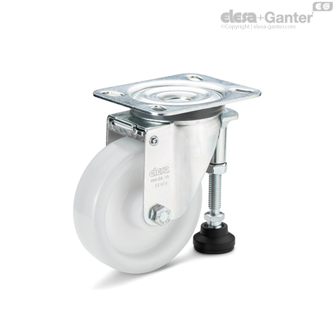 The wheel with non-slip foot makes it possible to lift trolleys or machinery in order to operate safely, while at the same time guaranteeing the possibility of making frequent movements by simply adjusting the hexagon of the foot, effectively transforming fixed workstations and work equipment into mobile workstations.