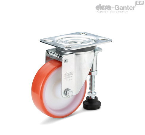 The wheel with non-slip foot makes it possible to lift trolleys or machinery in order to operate safely, while at the same time guaranteeing the possibility of making frequent movements by simply adjusting the hexagon of the foot, effectively transforming fixed workstations and work equipment into mobile workstations.